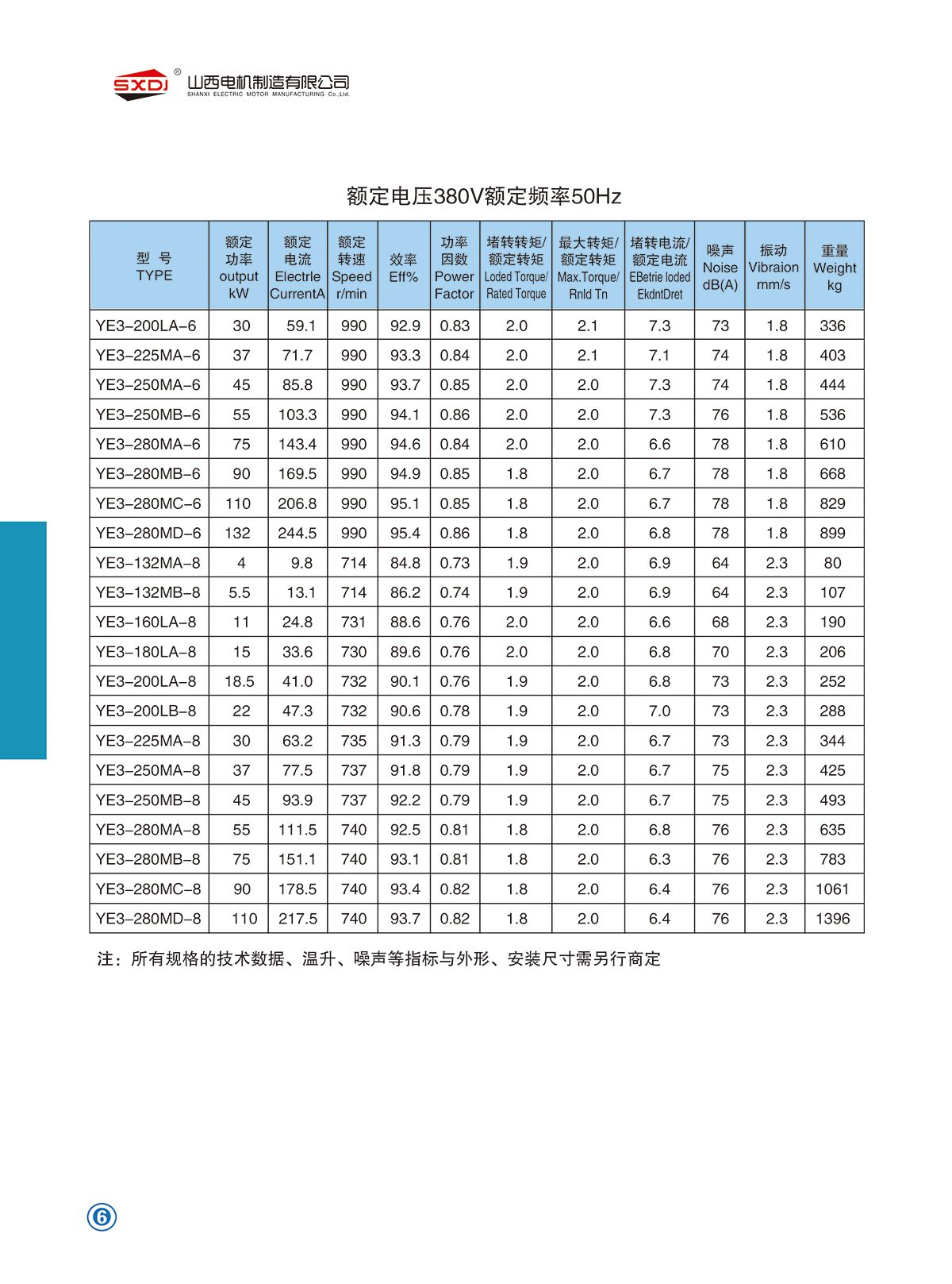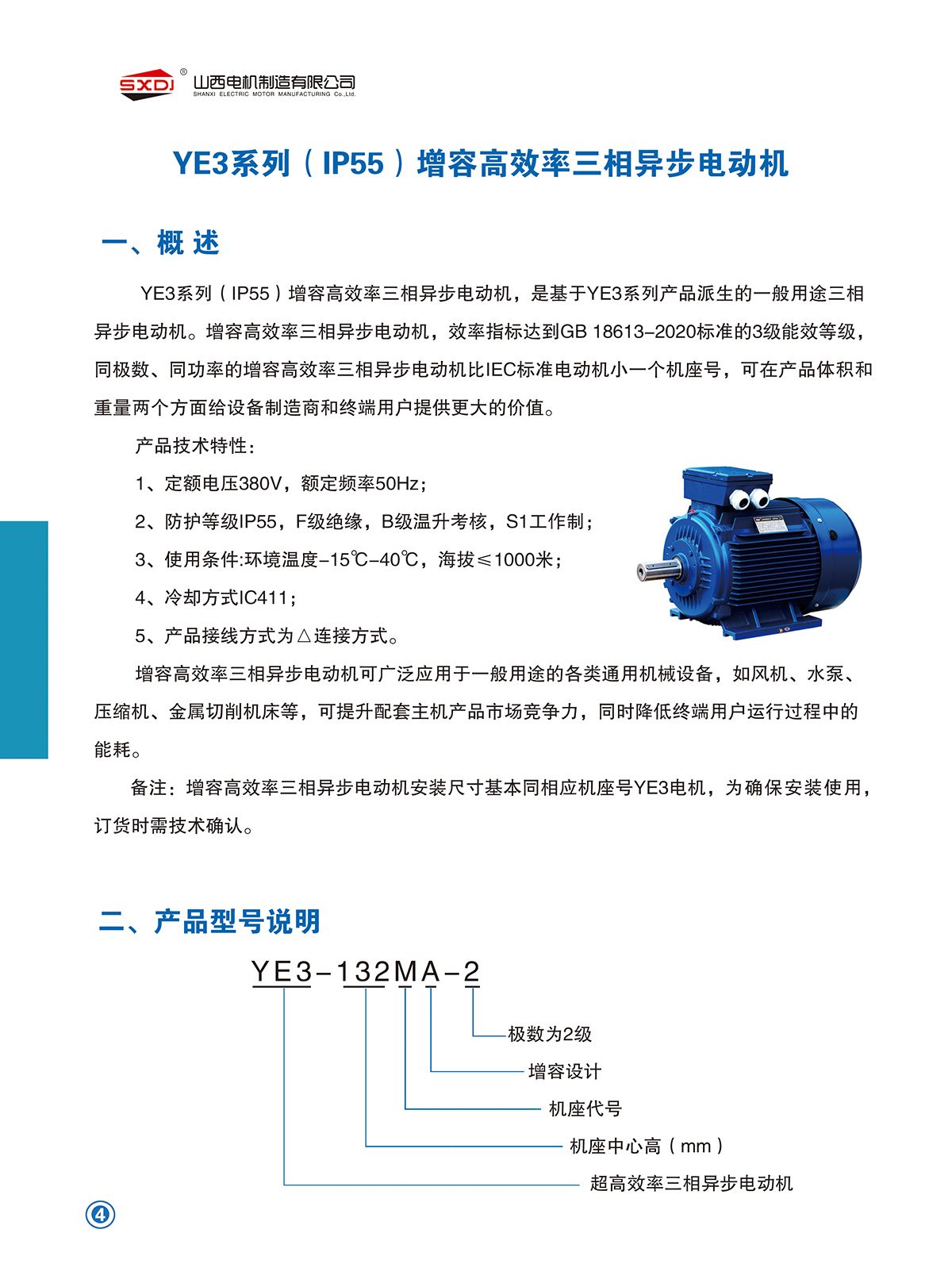 封閉式自扇冷卻籠型轉子高效三相異步電動機,設計符合IEC、GB等相關標準要求。YE3系列(IP55)增容高效率三相異步電動機,效率指標達到GB18613-2020《電動機能效限定值及能效等級》中3級能效水平。